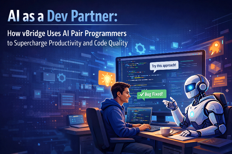 This blog explores how vBridge strategically integrates AI pair programming into our development lifecycle, the tangible benefits we’ve observed, and why this hybrid human–AI collaboration is shaping the future of software engineering.