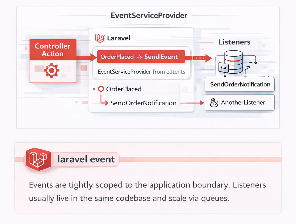 Instead of wiring listeners in EventServiceProvider , Laravel emits events outward. Kafka becomes the distribution layer beyond the framework
