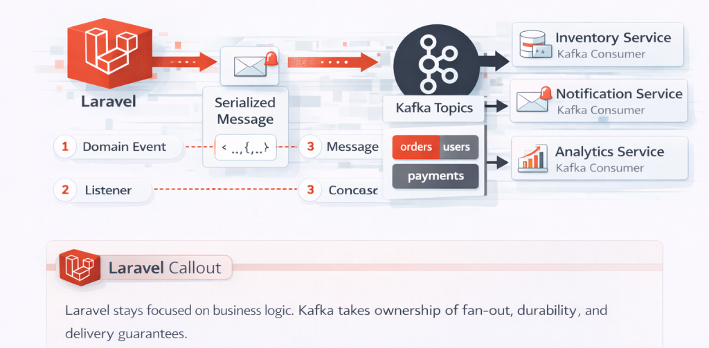 Laravel stays focused on business logic. Kafka takes ownership of fan-out, durability, and